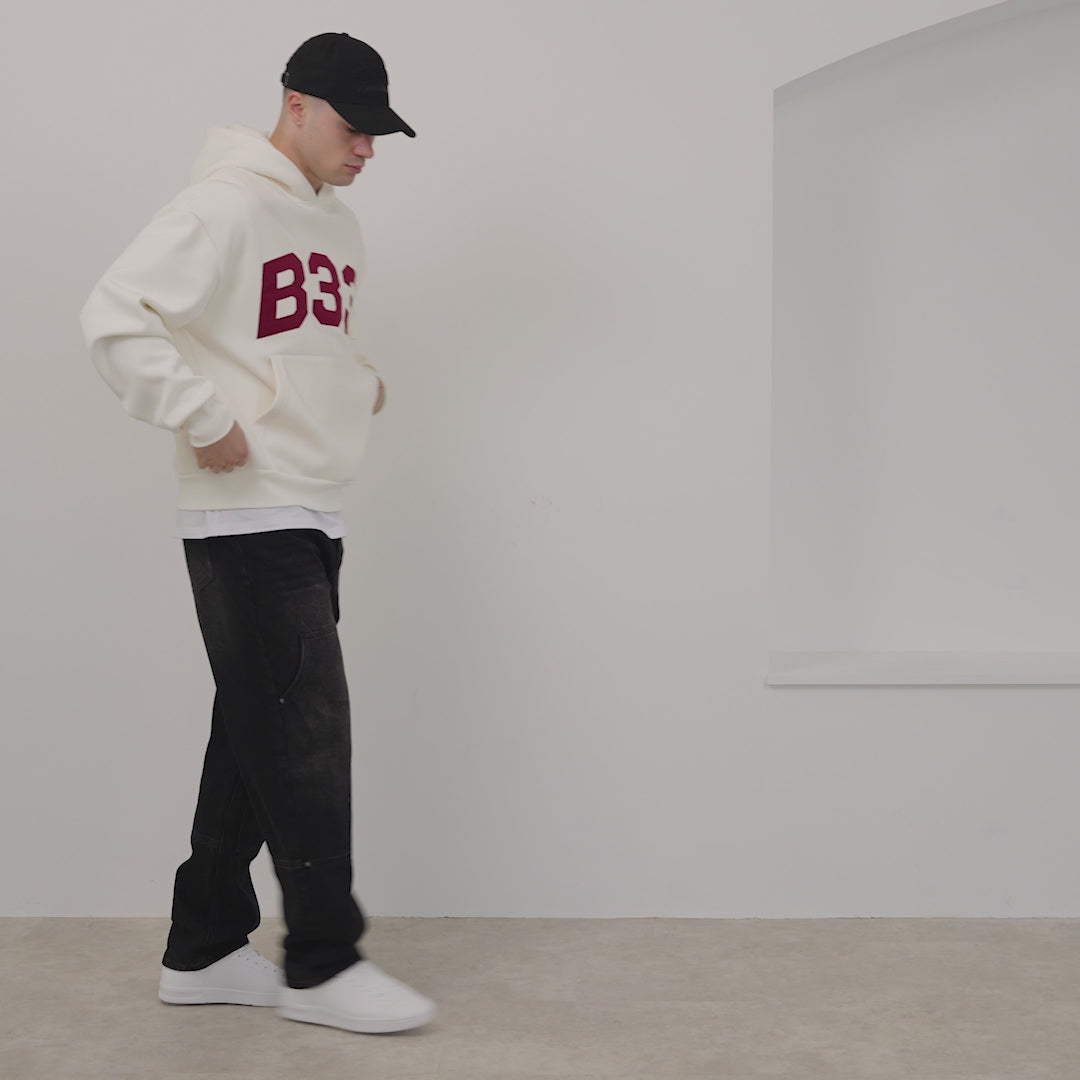 Elevate your style with our new Figo Hoodie in off white, crafted from premium waffle fabric with a super soft brushed backing for unbeatable comfort. Featuring an oversized silhouette for a relaxed, effortless look and a bold B33 logo across the chest for a statement finish. Completed with patch detailing on the sleeve.