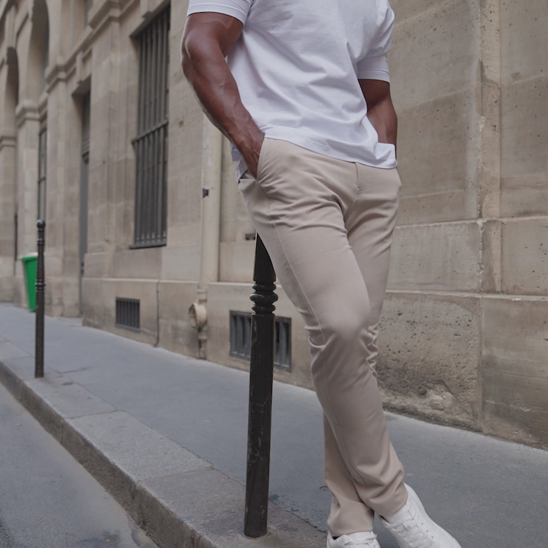 The Halle Chinos in Sand by Bee Inspired offer a clean, contemporary take on everyday smart-casual dressing. Crafted from our trademark chino fabric, these slim fit trousers are tapered to the ankle for a modern silhouette that balances comfort and style.