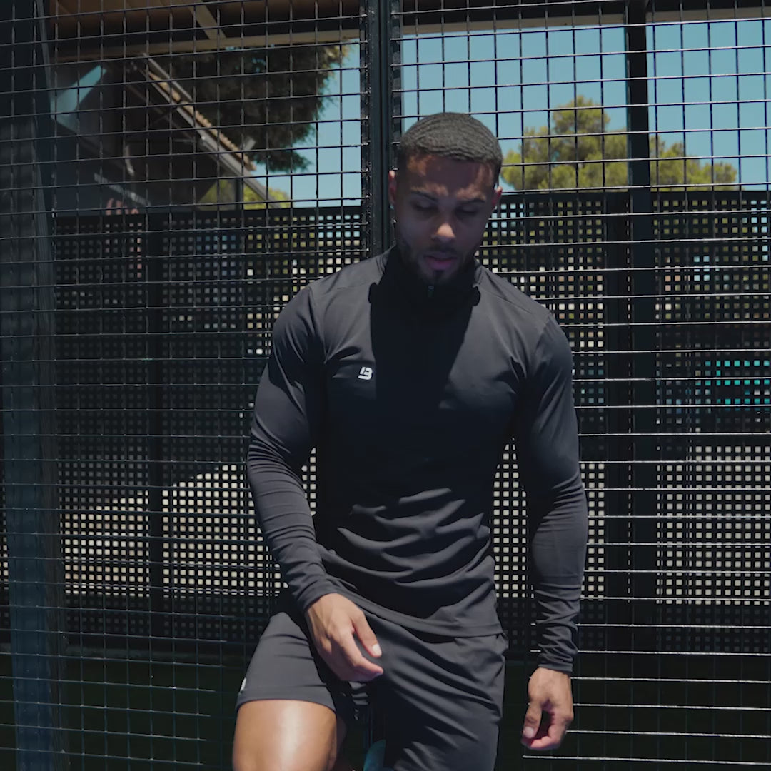 Our signature 1/4 zip in black is part of our new premium active lifestyle range. Comes with thumb hole in the sleeve.